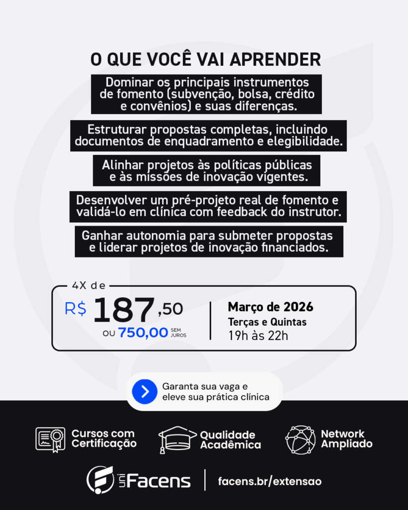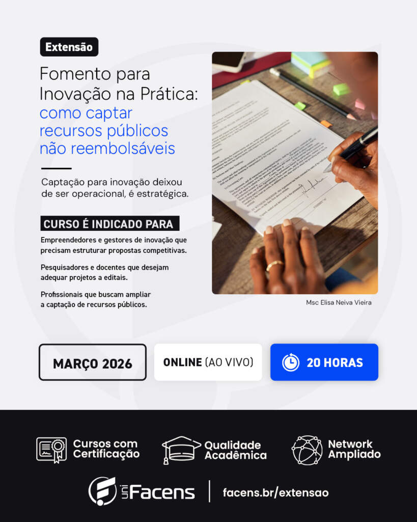 Pensando nisso, a UniFacens oferece o curso Fomento para Inovação na Prática: como captar recursos públicos não reembolsáveis, uma formação voltada para quem deseja aprender, de forma objetiva e aplicada, como acessar editais e programas de financiamento público para inovação.