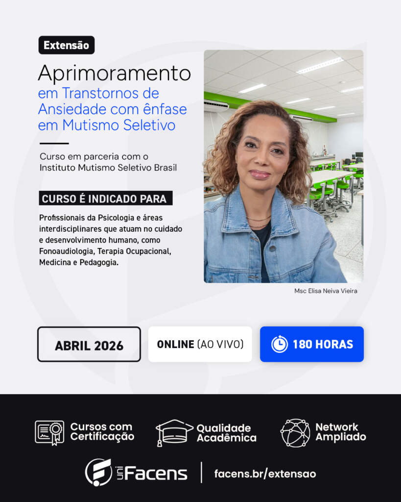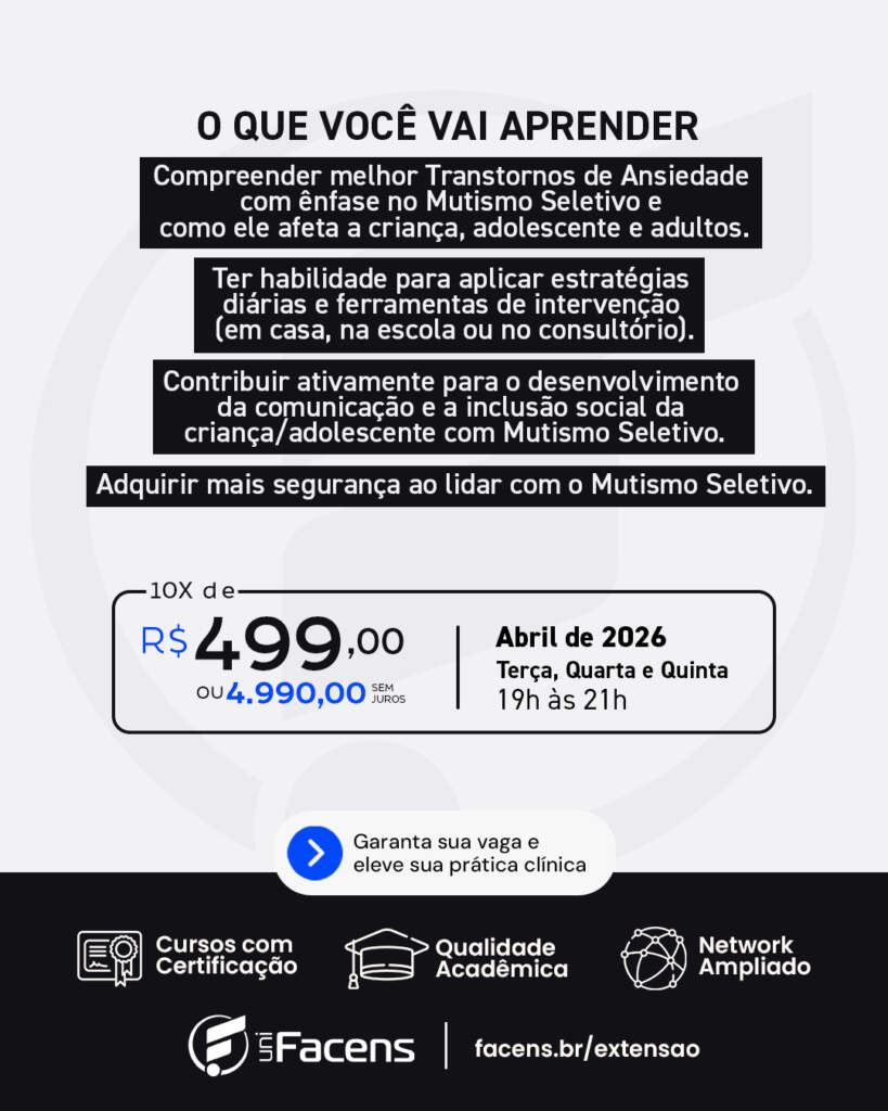 Com o aumento de diagnósticos e a carência de especialistas no Brasil, o curso de extensão “Transtornos de Ansiedade com ênfase em Mutismo Seletivo” da UniFacens surge como uma oportunidade relevante para profissionais das áreas de saúde e educação que desejam ampliar sua atuação clínica e técnica nesse campo.